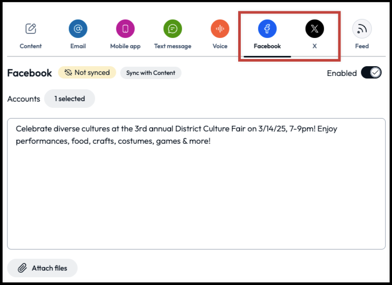 Here you can send a message directly out to your connected Facebook and/or Twitter (X) accounts. Click the Facebook and/or Twitter (X) icon to select these channels.
