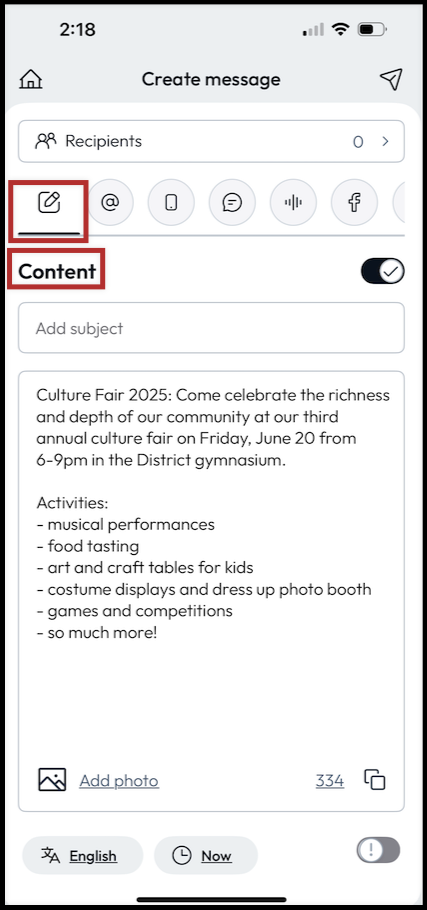 - Add subject: Create a subject for your message. This will auto-populate into your other delivery method channels.
