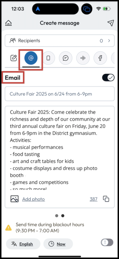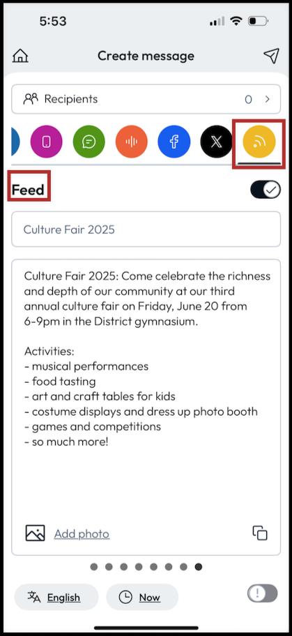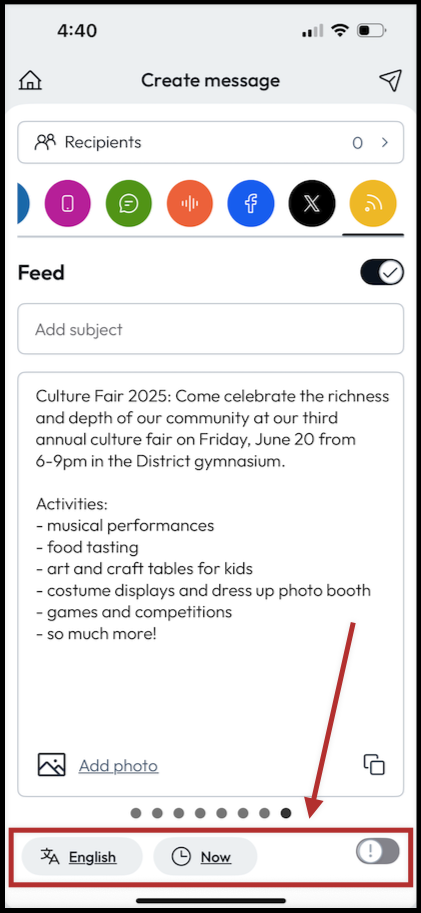Toggle the ! button in the bottom right corner of your screen to send your message out immediately to your district community as an Emergency message. This message will ignore all subscription settings and preferences set by users.