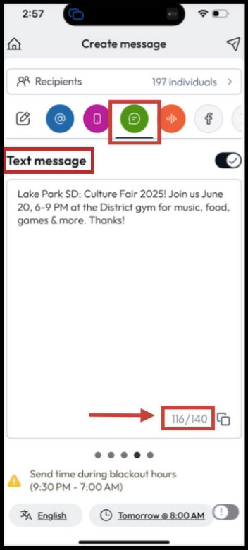 You may notice that the text carried over from the Content area is too long for the allowed SMS/Text message character limit. Shorten or adjust the length of your message to fit into the displayed character limit which is as follows: