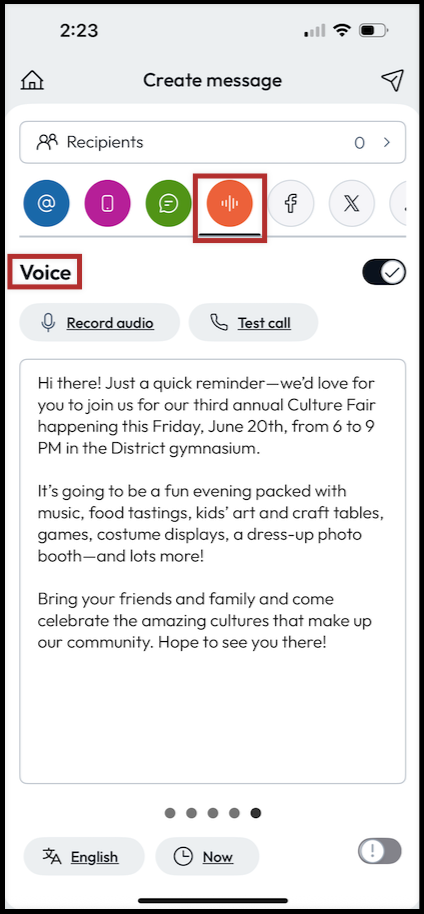 The text you entered into your Content area will automatically appear when you tap on the Voice icon. You may wish to change the message to be more conversational in tone than what will be used in your other channels.