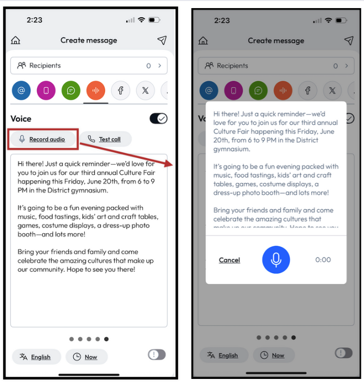 - Once you have added your text, click Record audio to record the voice message using your voice.