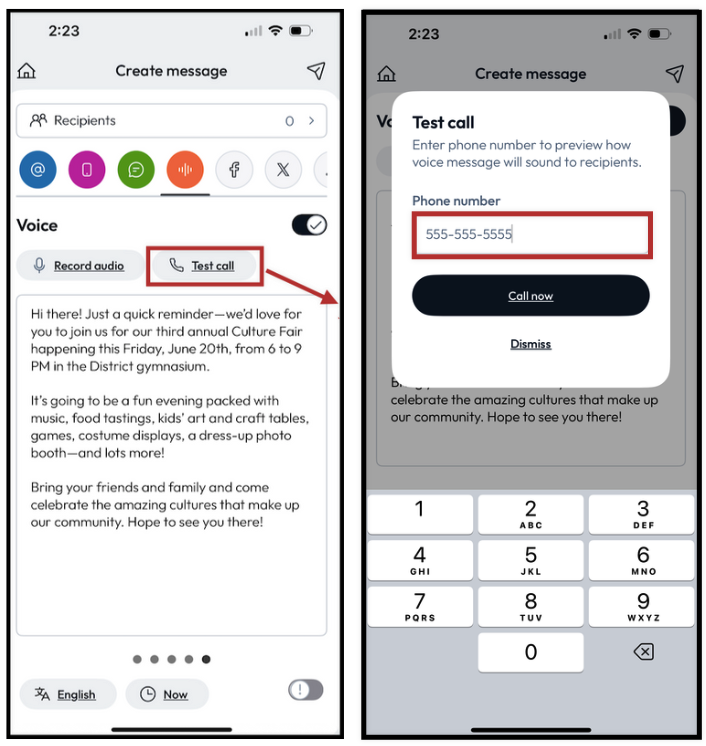 - Send a Test call to preview how this voice message will sound to your recipients.