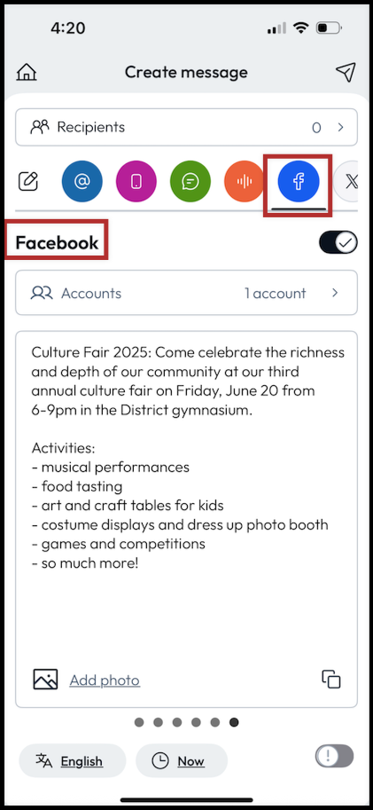 - To remove the Facebook channel, toggle off next to Facebook in the header. This means your message will not be sent to your recipients' Facebook accounts.