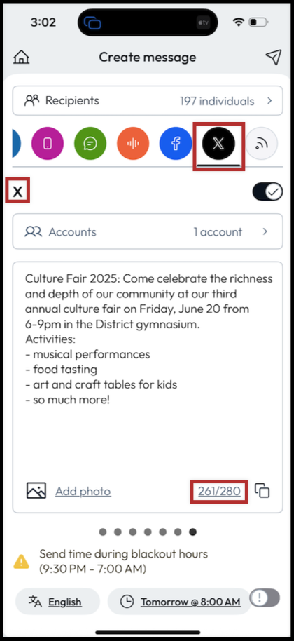 - To remove the X/Twitter channel, toggle off next to X in the header. This means your message will not be sent to your recipients' X/Twitter accounts.