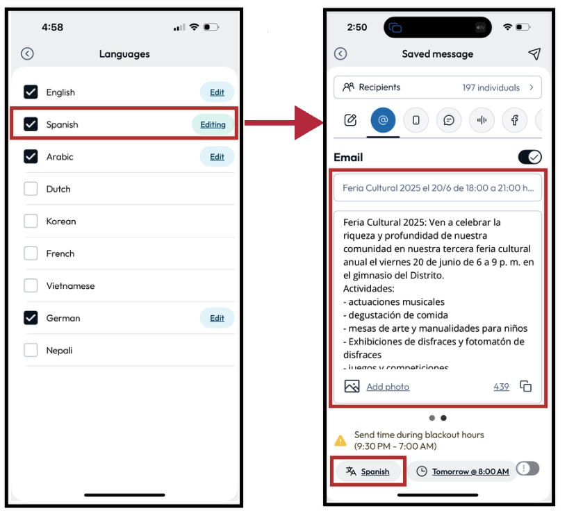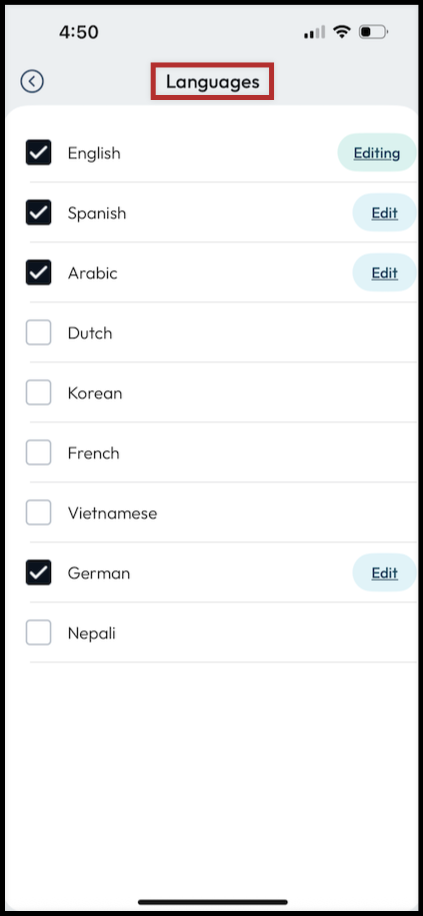 - Select Edit to preview and be directed to the screen to see a particular language in its translated form.
