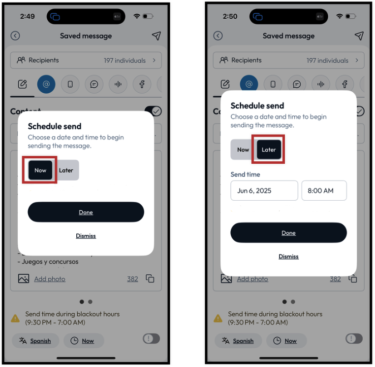 Send message: Want to send your message out immediately? Simply leave the toggle set to Now and click Done whenever you’re ready to send.