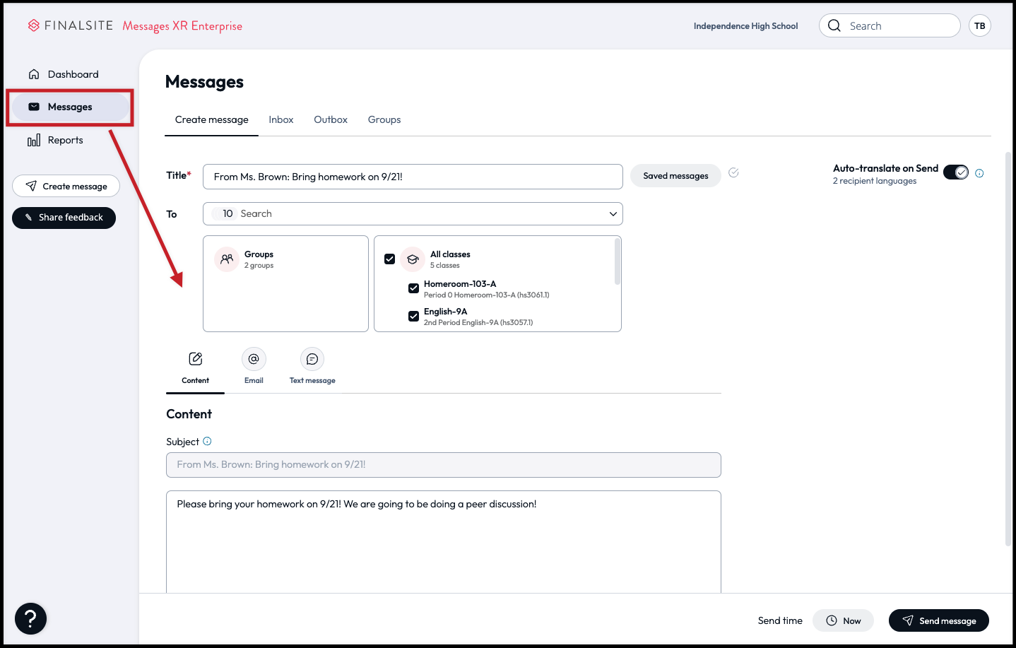 For educators using the Messages area, this space empowers you to send timely, student-focused communications via email, text, or voice—with full control over content and audience. Whether drafting your own message or choosing a ready-made option, you’ll have flexible tools to reach students and families with clarity, speed, and purpose. Message delivery times follow the settings established by your school or district.