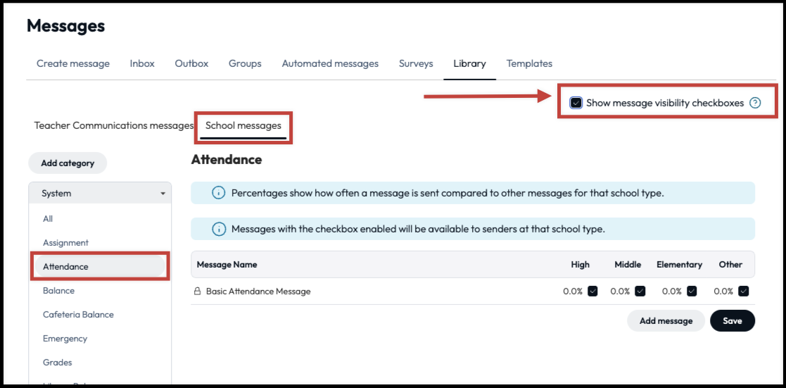 - Messages with the checkbox enabled will be available to senders at that school type.
