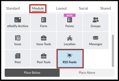 - On your new page, go into Compose mode, open up the Element library > Module tab and scroll down to insert the RSS Feeds element onto your blank page.
