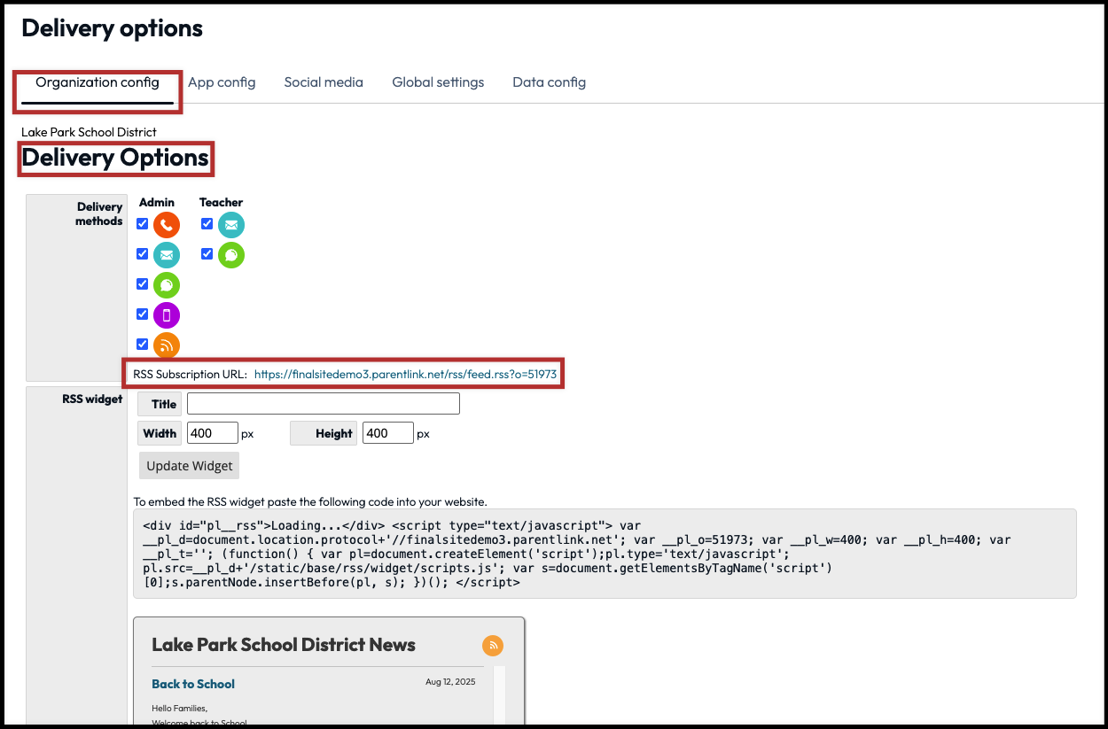 - Select the organization from which your message(s) leading to the RSS Feeds element will be sent. Once open, scroll down and select Delivery Options for that selected organization.